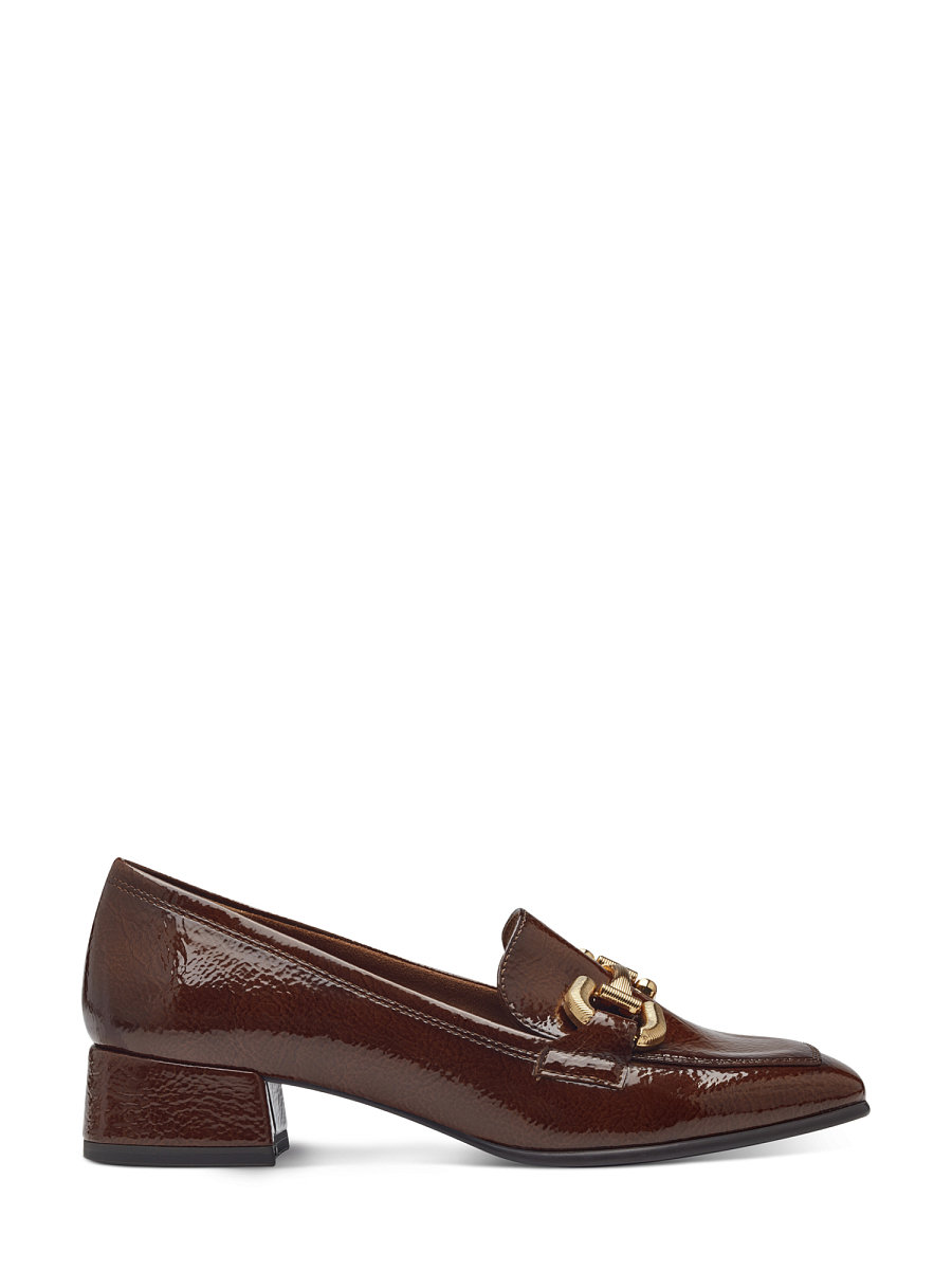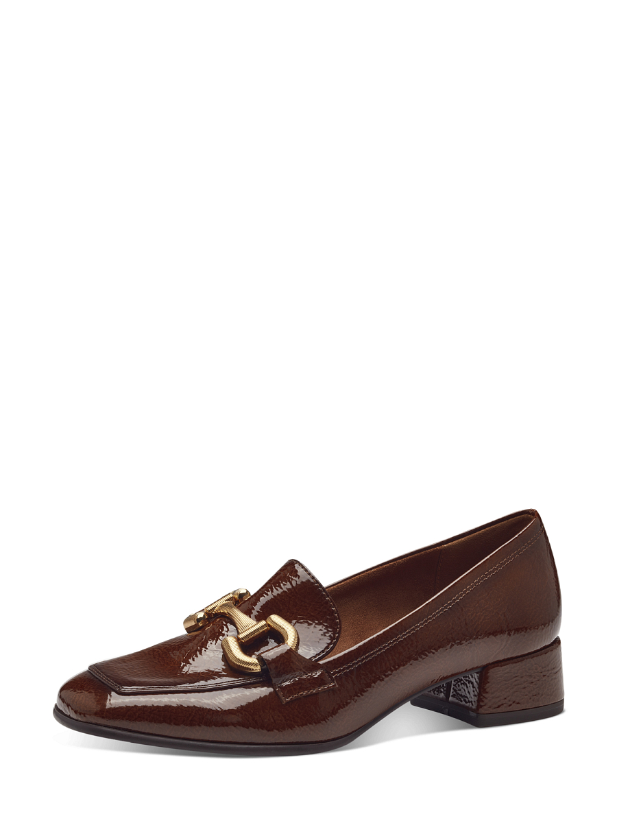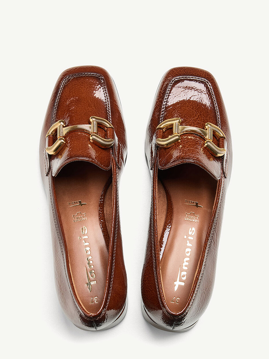 Disse elegante loafersene fra Tamaris kombinerer klassisk stil med moderne detaljer. Den glansfulle overflaten og den dekorative gullspennen gir skoen et sofistikert uttrykk som passer perfekt til både jobb og festlige anledninger. Den stabile blokkhælen på 35 mm og den firkantede tåformen gir et moderne preg og sikrer god balanse gjennom hele dagen.