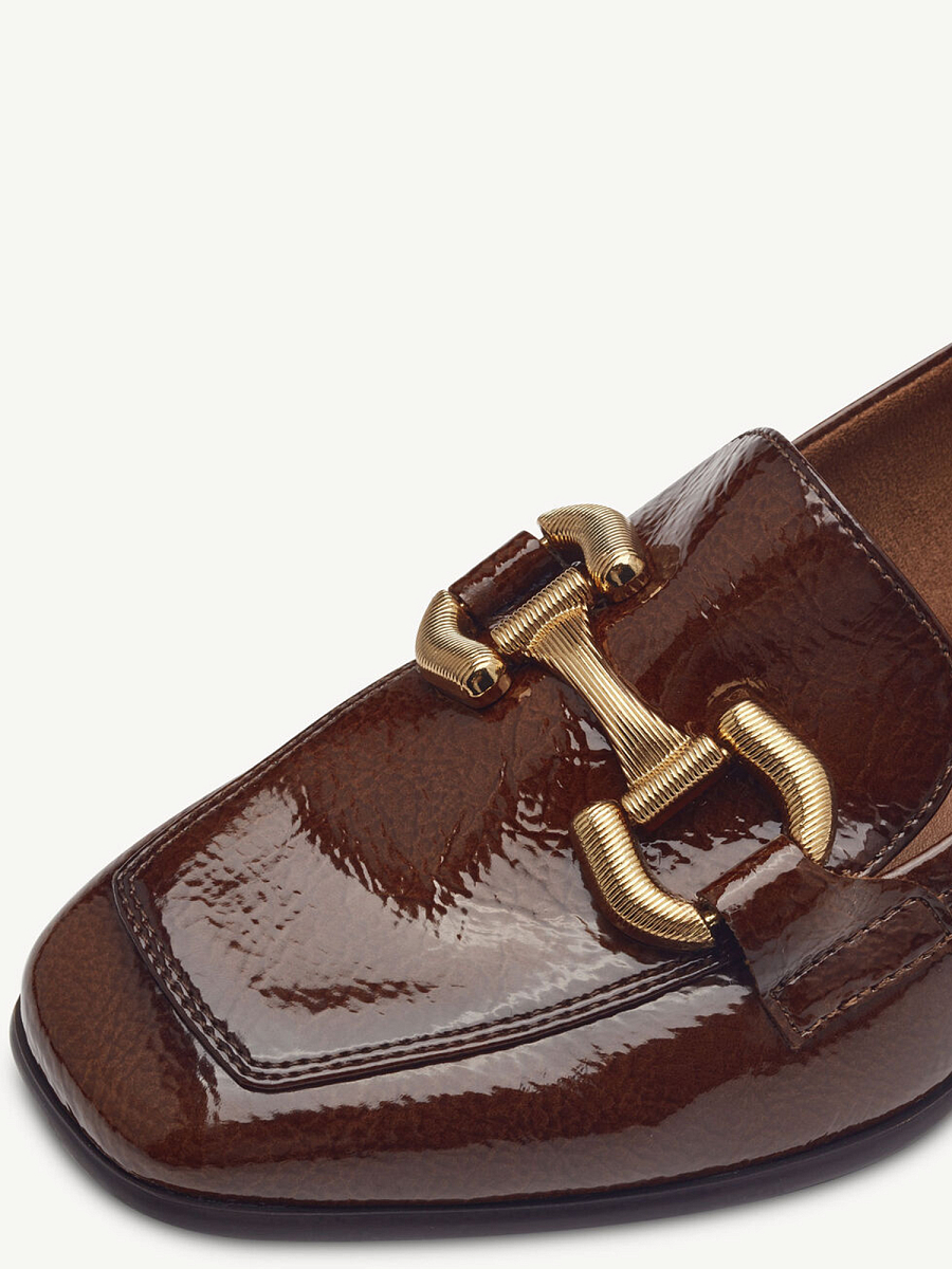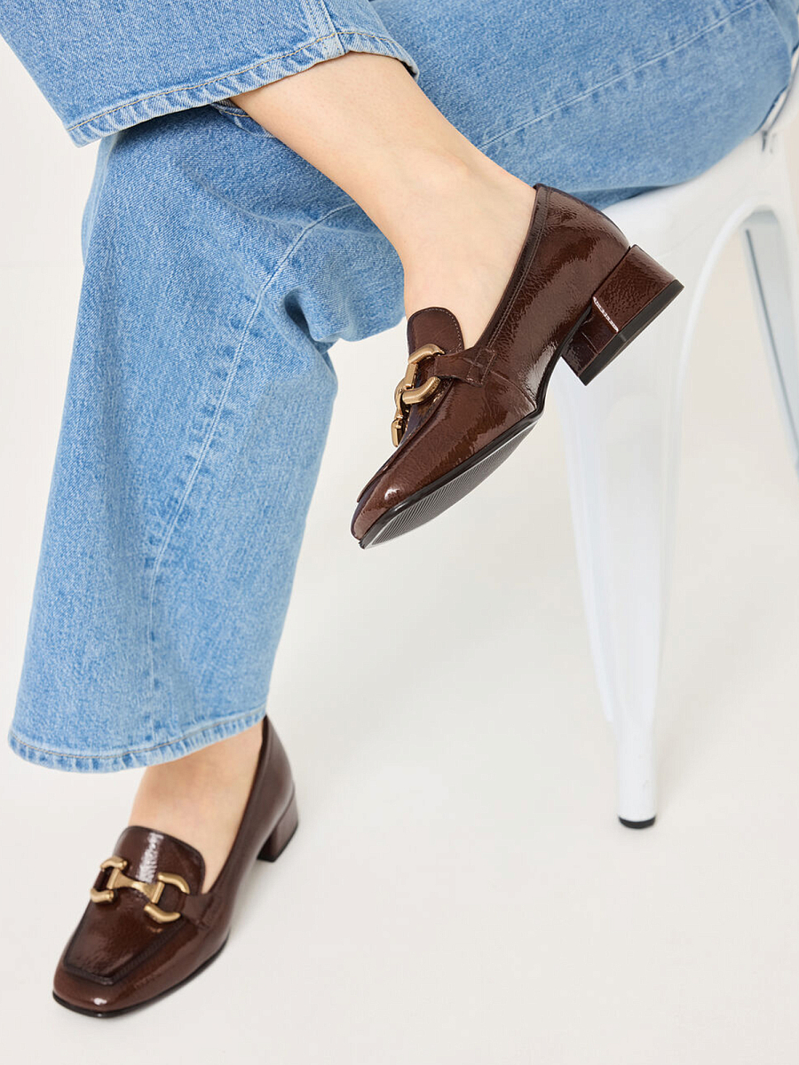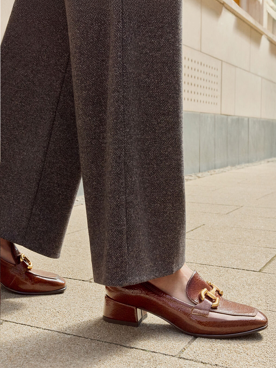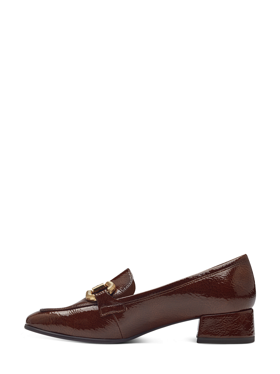 Disse elegante loafersene fra Tamaris kombinerer klassisk stil med moderne detaljer. Den glansfulle overflaten og den dekorative gullspennen gir skoen et sofistikert uttrykk som passer perfekt til både jobb og festlige anledninger. Den stabile blokkhælen på 35 mm og den firkantede tåformen gir et moderne preg og sikrer god balanse gjennom hele dagen.