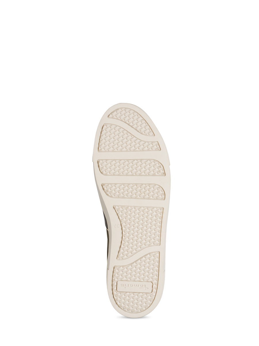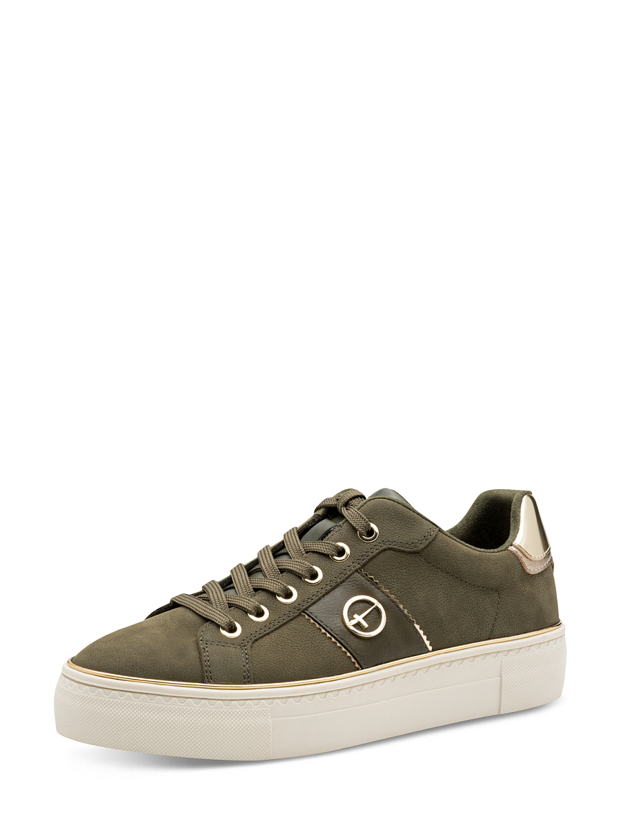 Tamaris Varella Sneakers Green kombinerer moderne design med sporty eleganse. Den friske grønnfargen med metalliske detaljer gir et stilrent uttrykk som passer både til hverdagsbruk og mer avslappede anledninger. Modellen er laget i en slitesterk kombinasjon av skinn og tekstil som gir god pusteevne, mens den myke tekstilinnersiden sørger for en behagelig følelse hele dagen. Den runde tåformen og den kraftige sålen gir både stabilitet og komfort ved hvert steg. Takket være uttakbar innersåle og COMFORT-fôr får du en luftig og fleksibel passform som tilpasser seg fotens naturlige form.