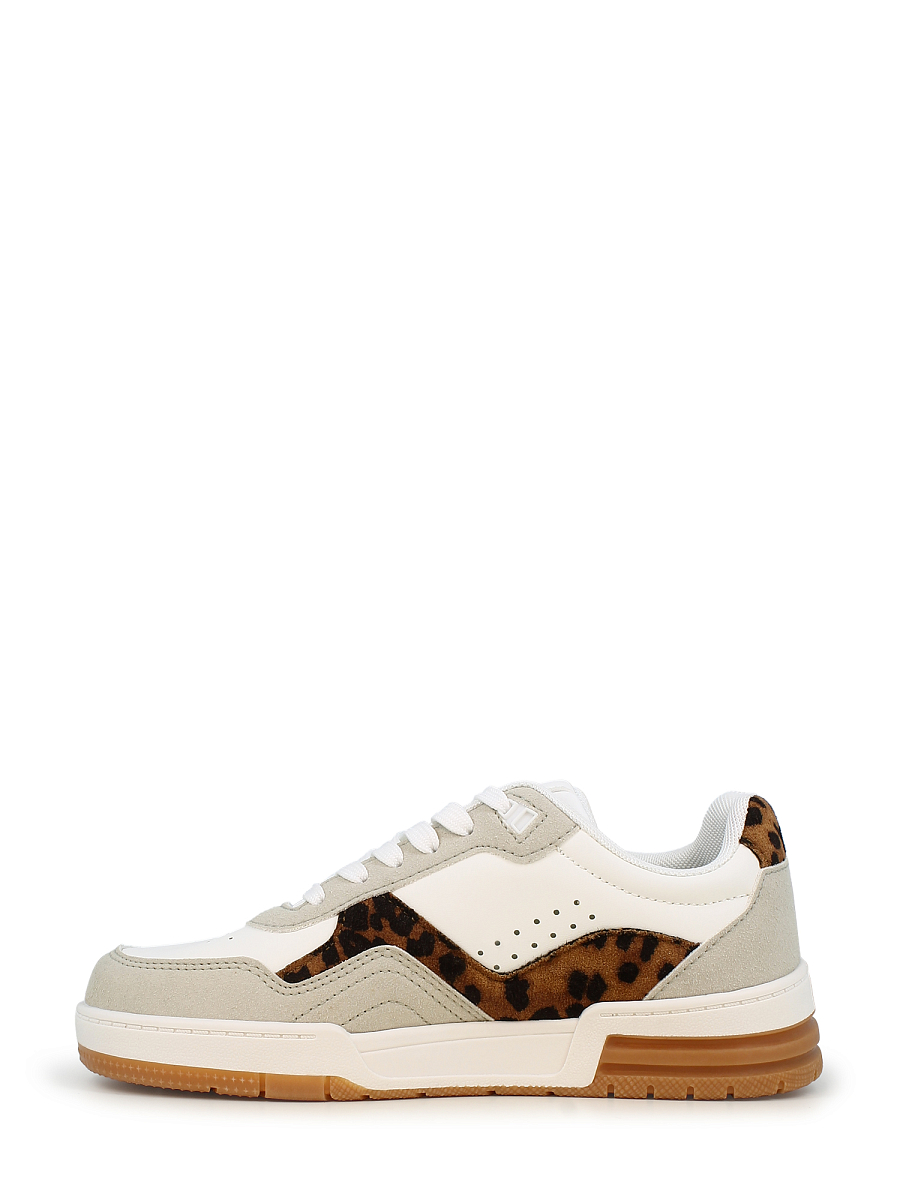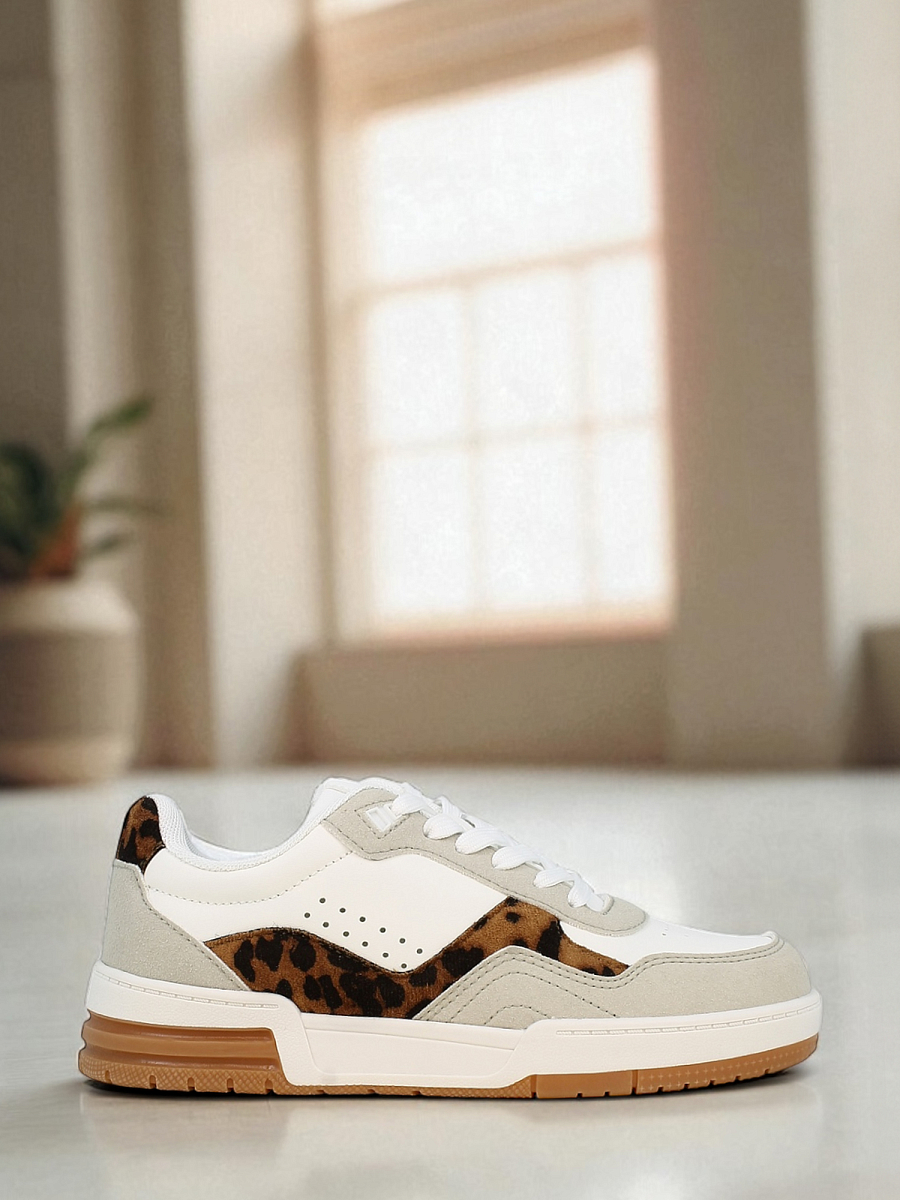 Core Court Leo er en sporty og iøynefallende sneaker med lekne detaljer og et moderne uttrykk. Overdelen er laget i syntetiske materialer og kombinerer hvitt og beige med partier i leopardmønster i semsket look – helt uten bruk av ekte skinn. Den kraftige gummisålen gir godt grep og stabilitet, mens polstret krage og myk innersåle sikrer komfort hele dagen.