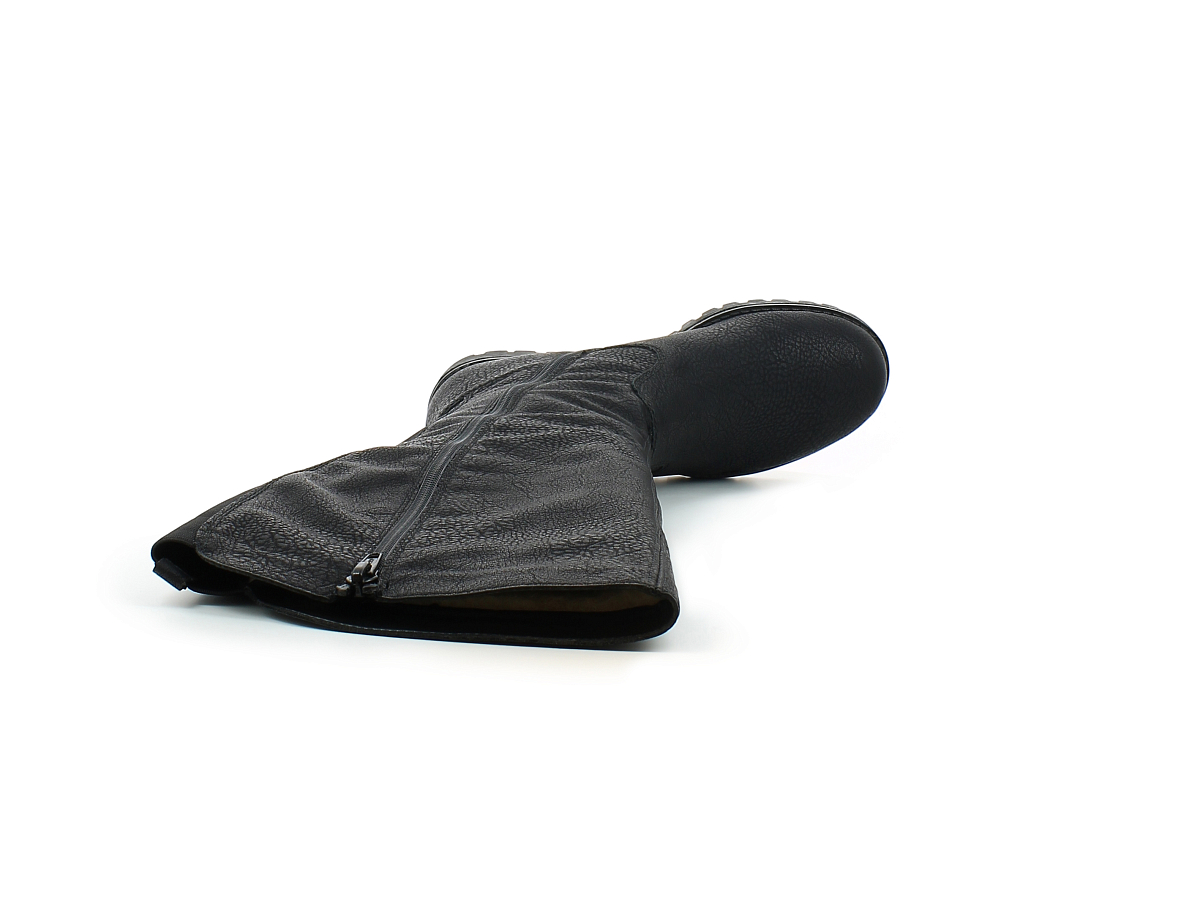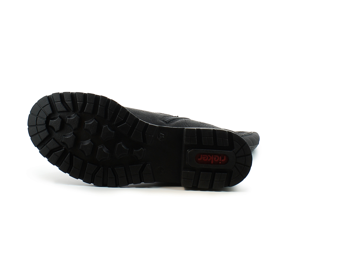 Sorte RIEKER-støvler med innlagte gummibånd i overdelen bak tilpasser seg perfekt til føttene dine. Takket være glidelåsen på innsiden av skoen vil de være enkle å ta på. På kalde dager vil du sette pris på den ekte saueullisolasjonen. Sålen med grovt mønster er fleksibel og absorberer støt ved stepping takket være Antistress-teknologi. Ideelle sko for jobb eller tur.