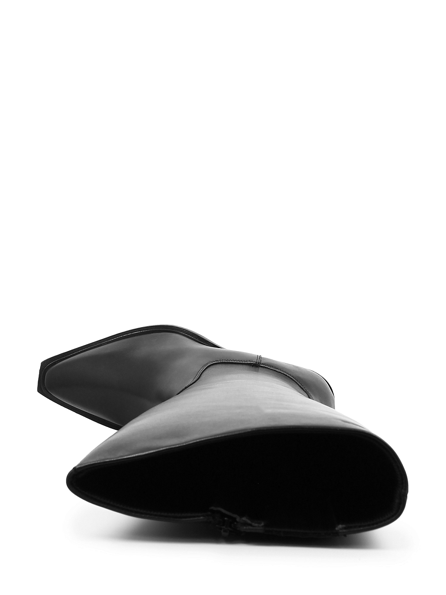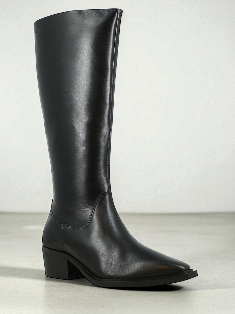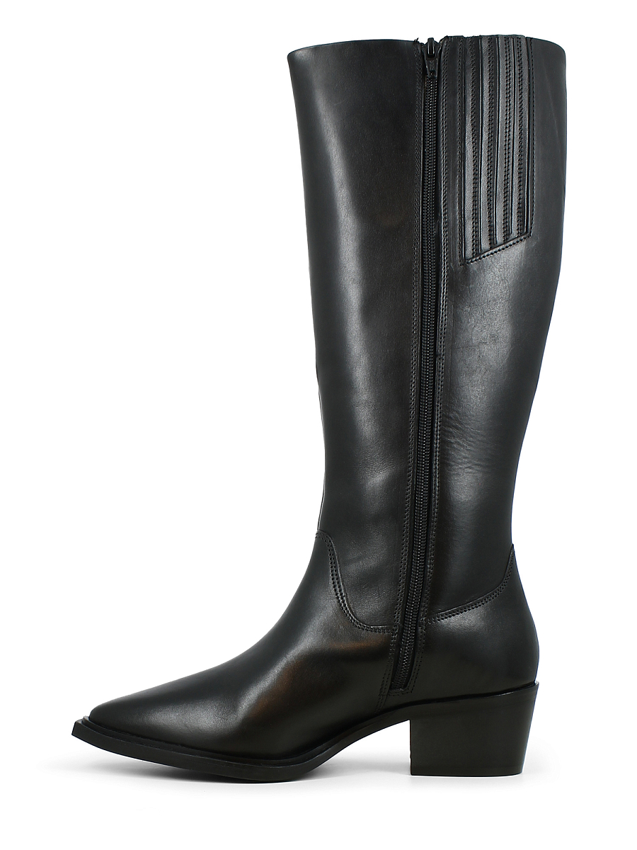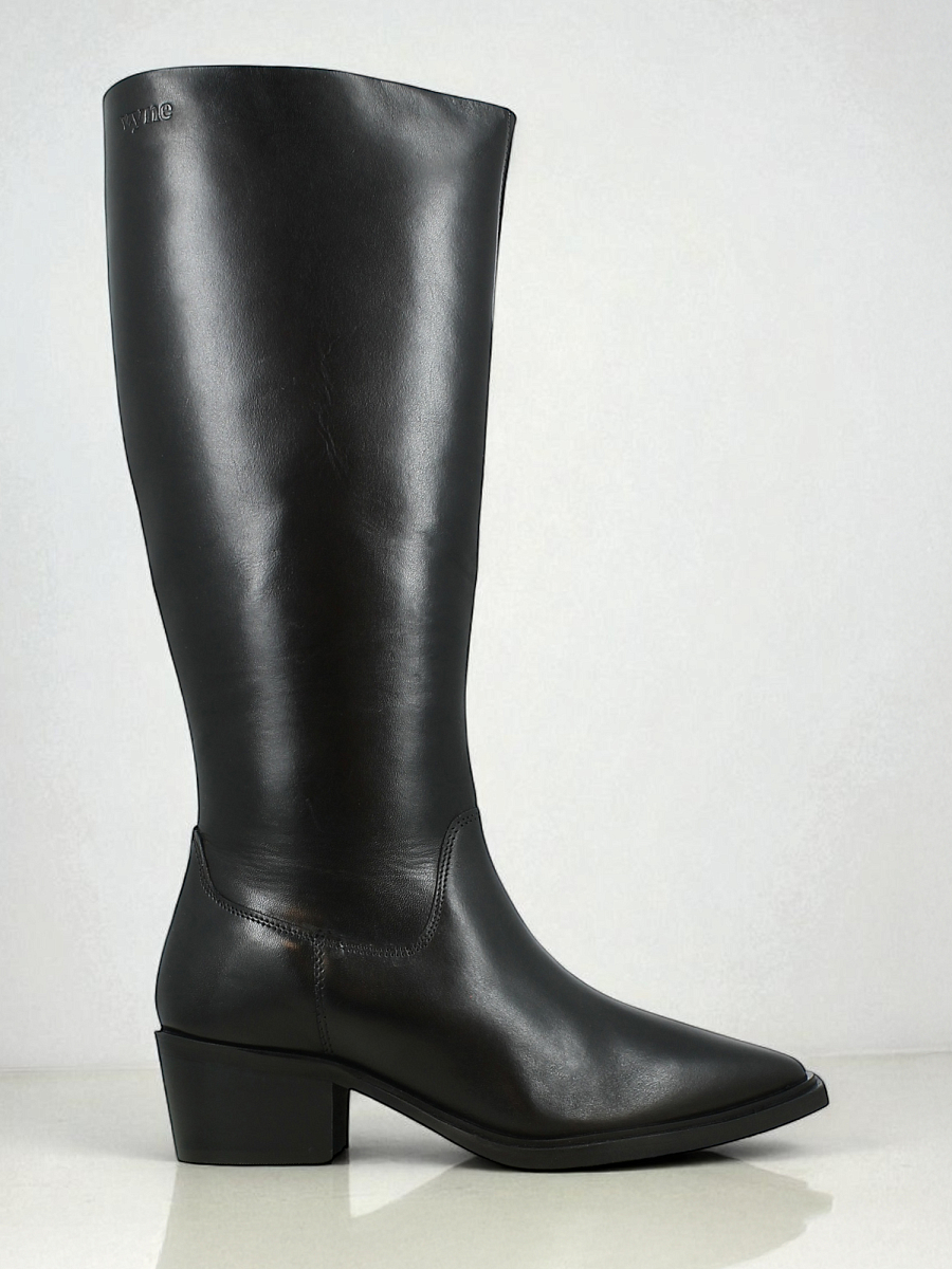 En elegant, høy boots fra Vyne i glatt og solid kuskinn fra Sør-Amerika. Modellen har en feminin og tidløs silhuett med spiss tå og middels høy hæl som gir et sofistikert uttrykk. Glidelås på innsiden gjør den enkel å ta av og på, mens elastiske paneler øverst gir fleksibilitet og en behagelig passform som tilpasses ulike leggstørrelser. Den solide yttersålen sikrer lang holdbarhet, og den blanke skinnfinishen gir et eksklusivt preg som løfter ethvert antrekk.