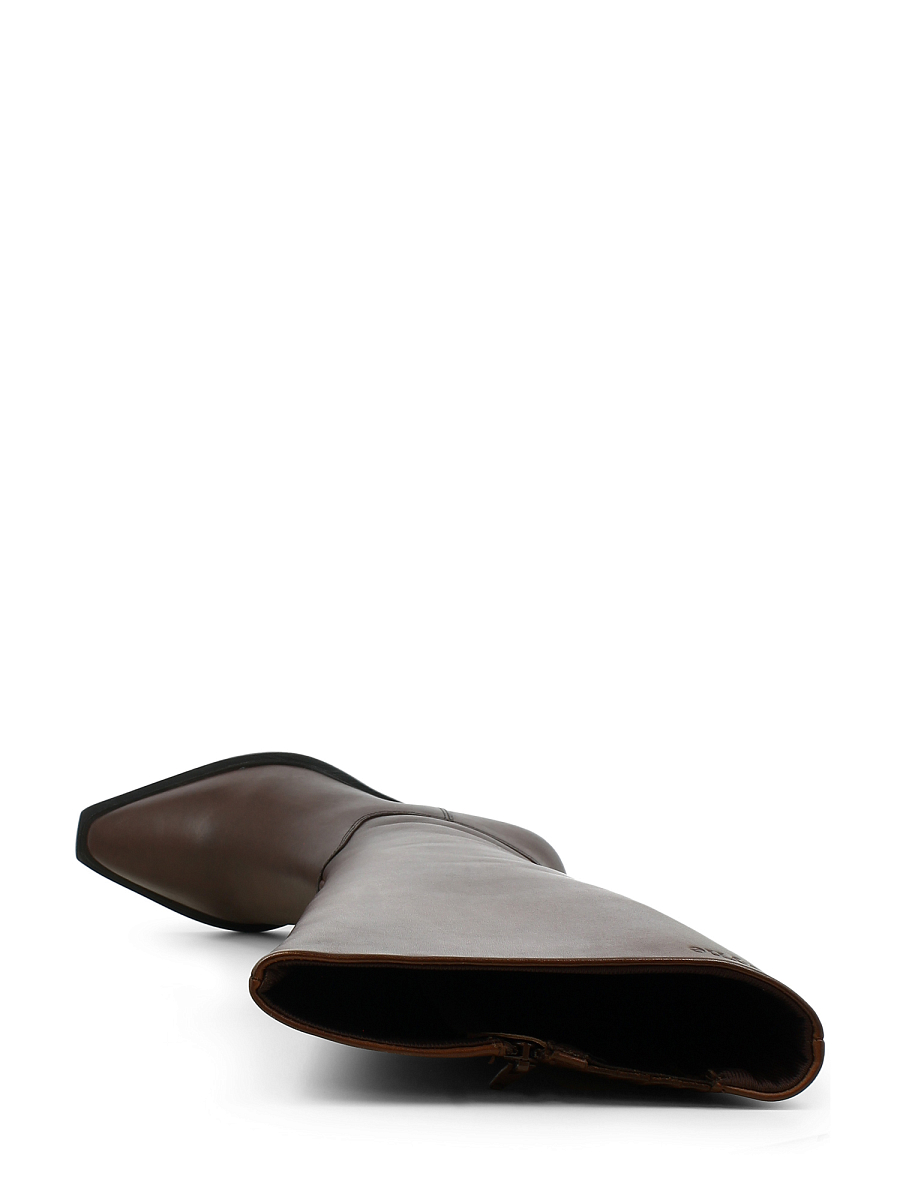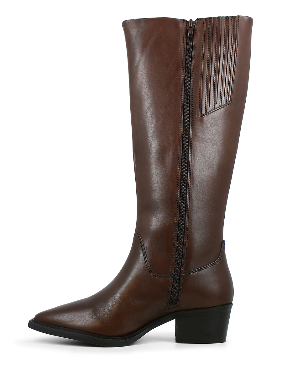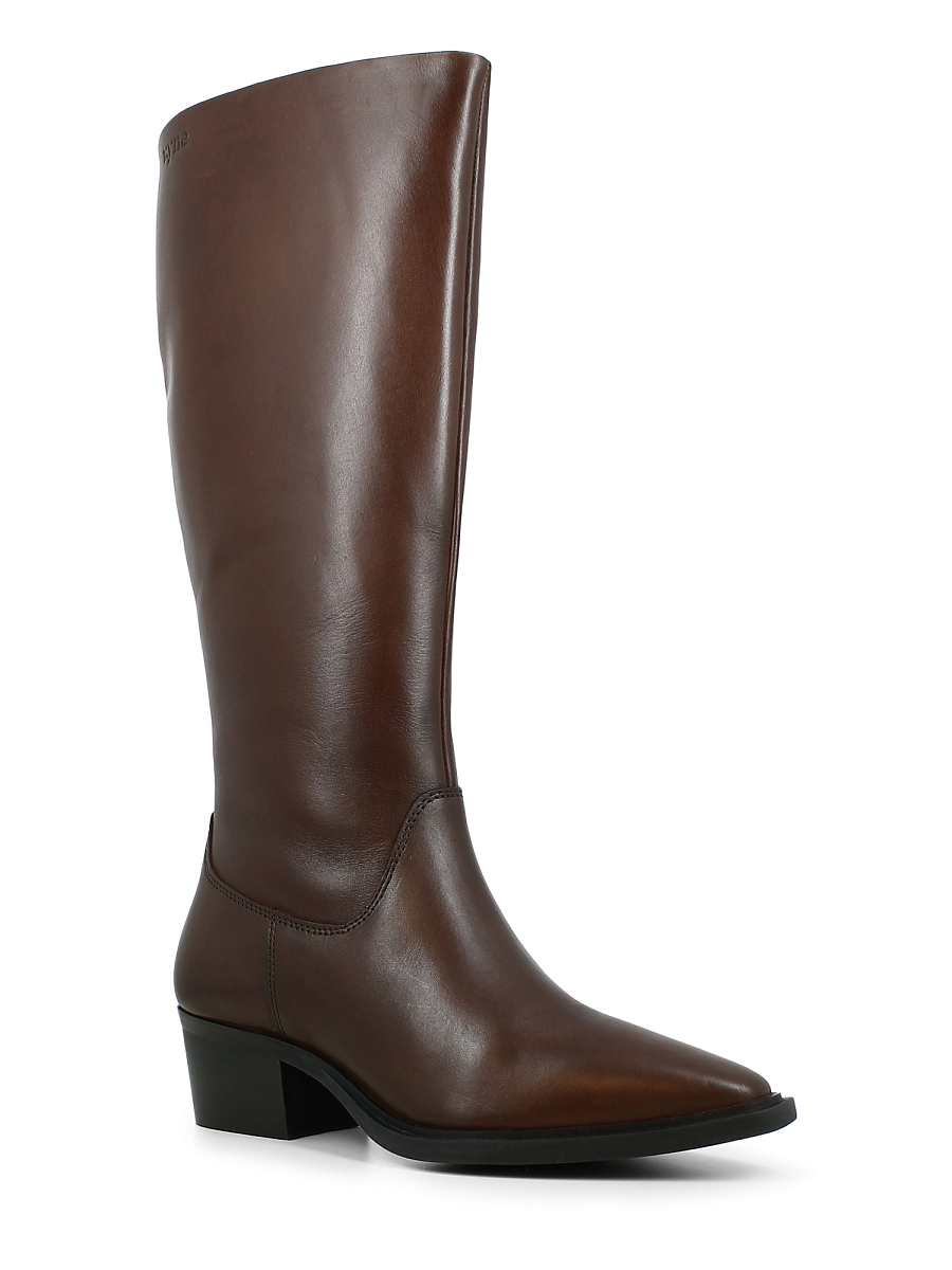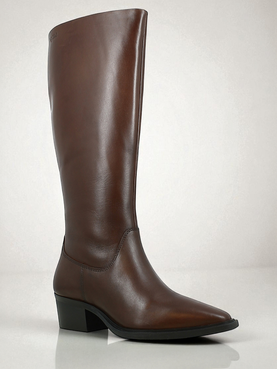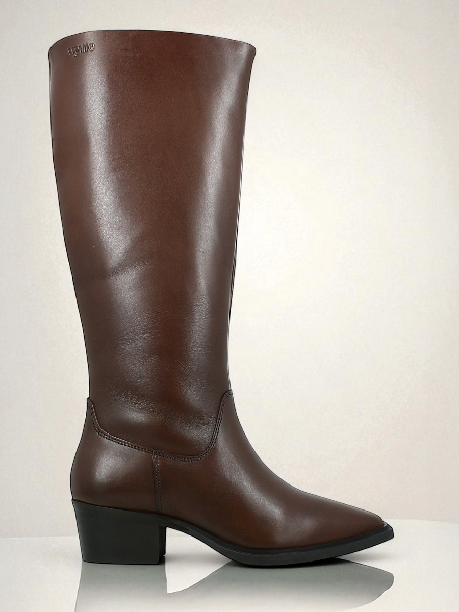 En elegant, høy boots fra Vyne i glatt og solid kuskinn fra Sør-Amerika. Den dype bruntonen fremhever det tidløse designet og gir et varmt, eksklusivt uttrykk. Modellen har en spiss tå og middels høy hæl som gir en feminin silhuett med klassisk western-preg. Glidelås på innsiden gjør den enkel å ta av og på, mens elastiske paneler øverst sørger for en fleksibel og behagelig passform som passer ulike leggstørrelser. Den solide yttersålen gir god stabilitet og lang holdbarhet.