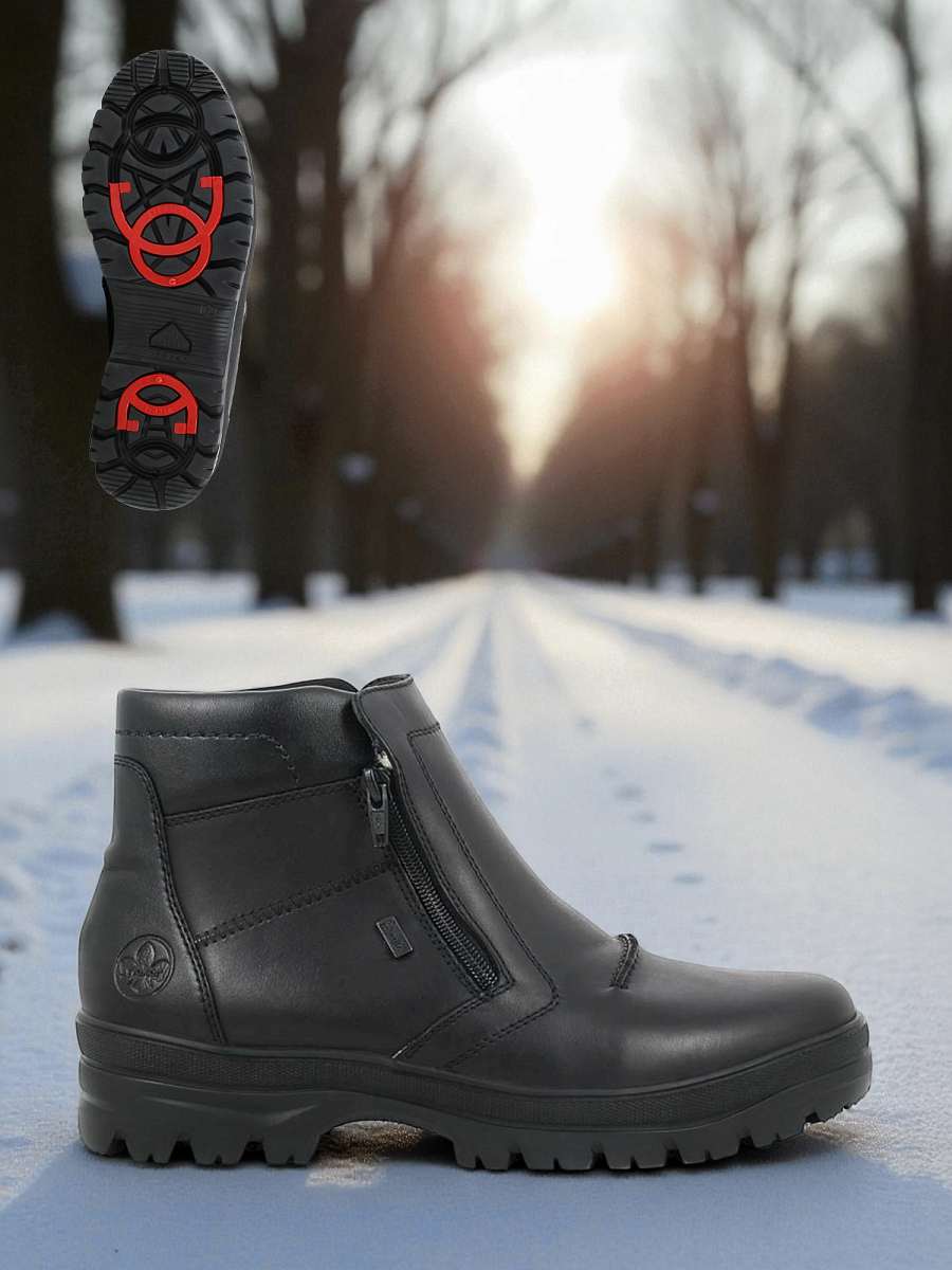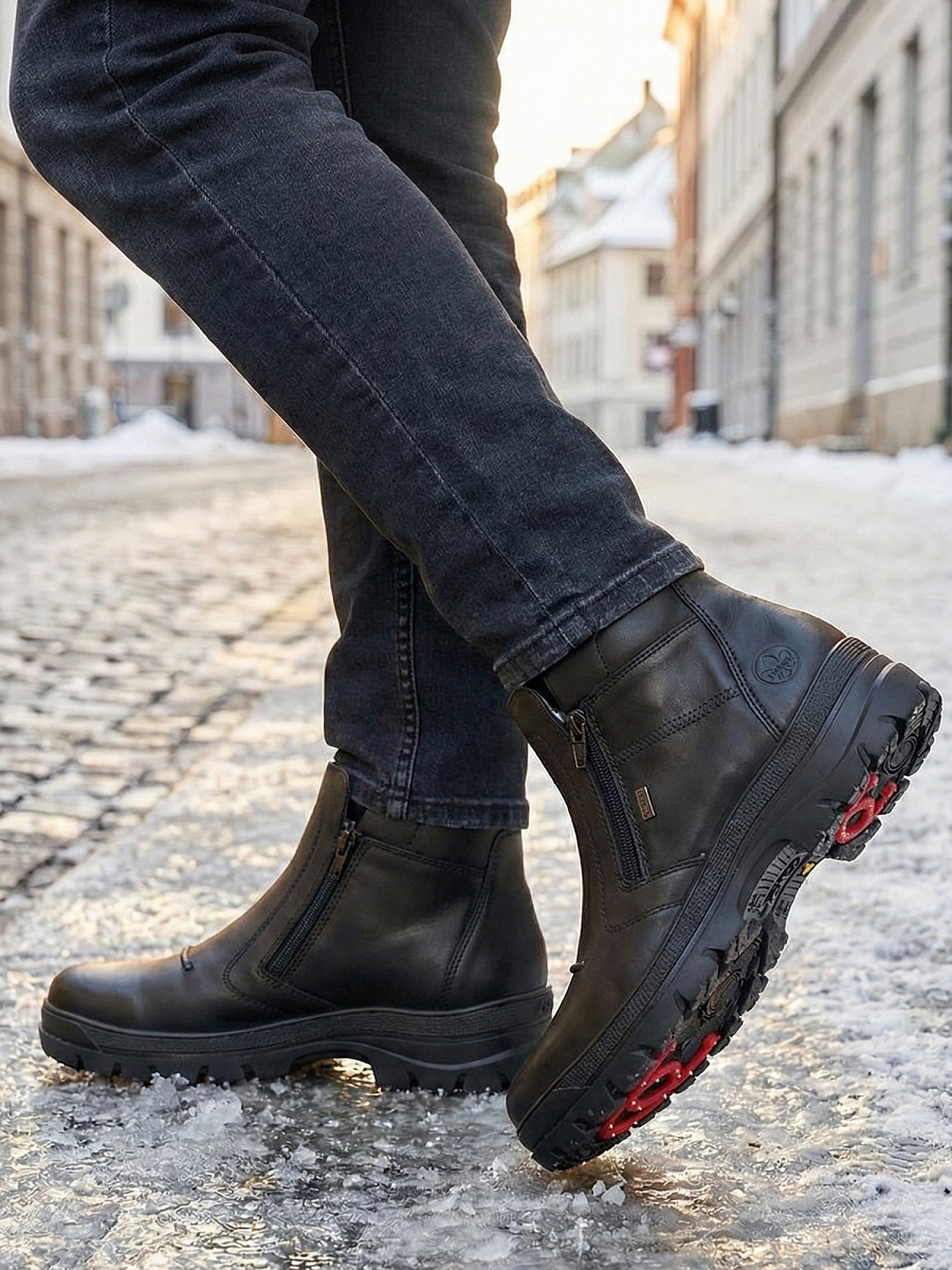 Rieker Fjellmark er en varmforet ankelstøvel for herre med rent, glatt uttrykk og praktiske detaljer for kalde og glatte dager. Den sorte overdelen i skinn kombinert med syntetiske partier har doble glidelåser – én funksjonell for enkel av- og påtagning og én dekorativ som understreker det stilrene designet. Inne i skoen finner du fôr i ekte virgin ull som isolerer godt selv i minusgrader, mens RiekerTEX-membranen holder smelteføre og slaps ute uten å stenge for pusteevnen. Den tykkere yttersålen er utstyrt med Rieker Grip, et toposisjons system med utfellbare pigger som gir sikkert feste på is og hardpakket snø. Antistress-konstruksjonen gjør støvelen lett, fleksibel og støtdempende, og komfortbredde G gir mer rom i forfoten. Uttakbar innersåle gjør det enkelt å lufte eller bytte ved behov. Hælhøyde ca. 4,5 cm, skafthøyde lav (ca. 11–15 cm). Lukking med glidelås, uten snøring.