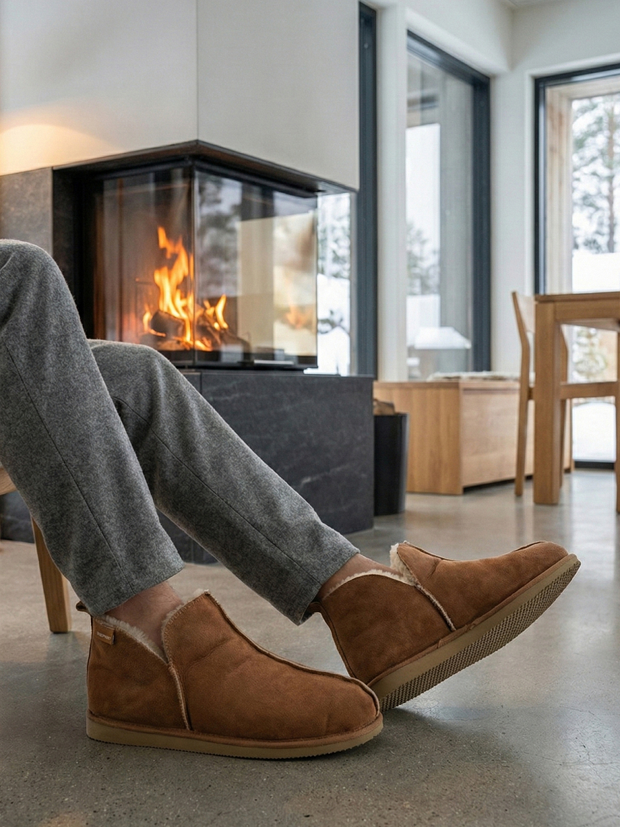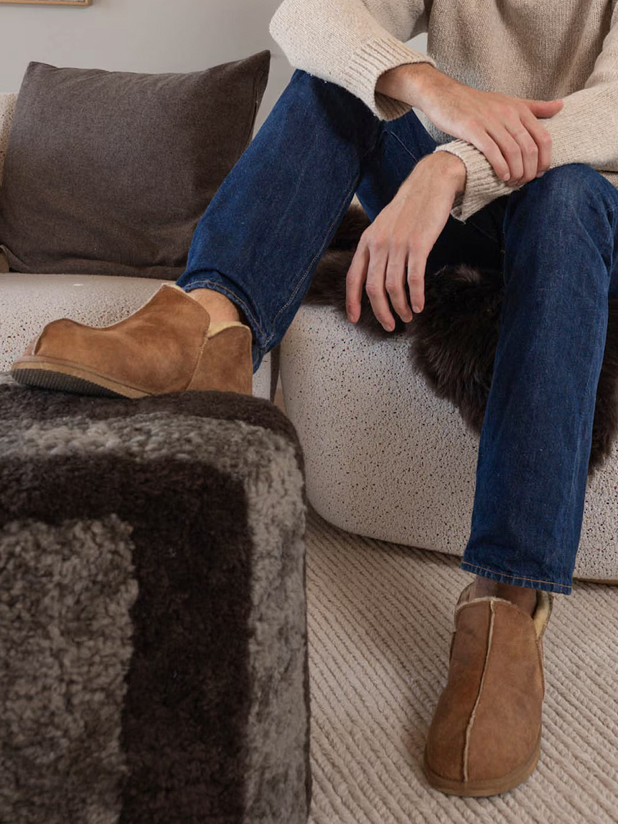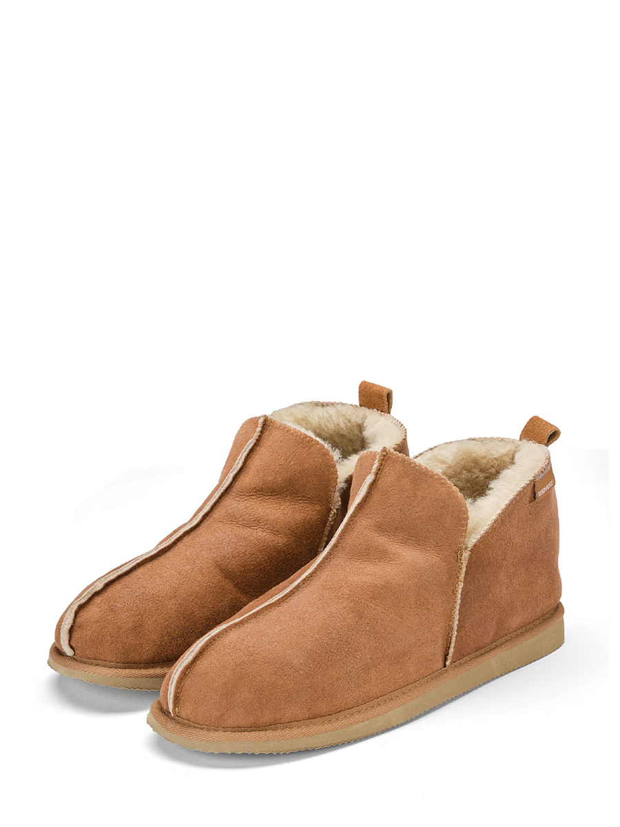 Shepherd Anton er en ankelhøy herretøffel i mykt saueskinn, her i fargen antique cognac. Modellen er kjent for sin varme og komfortable passform, og har i mange år vært en av merkets mest populære varianter. Det naturlige saueskinnsfôret gir jevn og behagelig varme, mens små sidesplitter gjør det enkelt å ta tøflene av og på. Synlige sømmer og en hempe i semsket skinn bak gir et rent og tidløst uttrykk. Yttersålen i lett og slitesterk EVA gir god støtdemping og gjør Anton praktisk både på kalde gulv og for små turer ut på terrassen eller ved raske ærend. Modellen finnes også i str. 36–42 under navnet Annie.