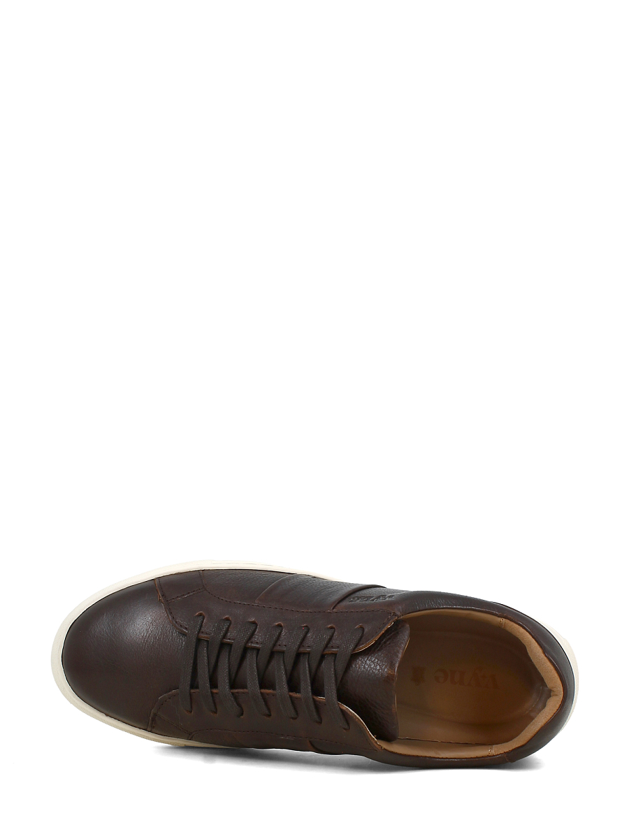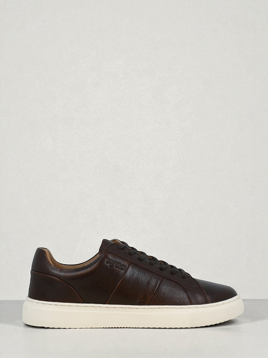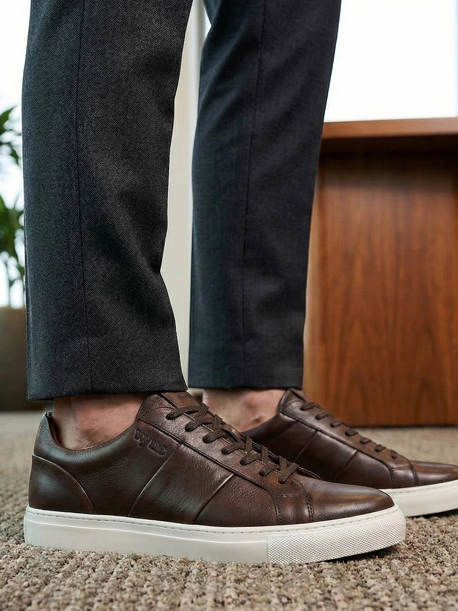 En eksklusiv herresneaker fra Vyne, laget i mørkebrunt cow luna-kuskinn fra storfe – et naturlig skinn kjent for sin jevne struktur, myke overflate og høye slitestyrke. Den dype bruntonen og den rene silhuetten gir et sofistikert uttrykk som passer like godt til jeans som til chinos. Modellen har en fleksibel gummisåle som gir stabilitet og godt grep, mens den anatomisk formede innersålen følger fotens naturlige kurver og gir behagelig demping og støtte gjennom hele dagen.