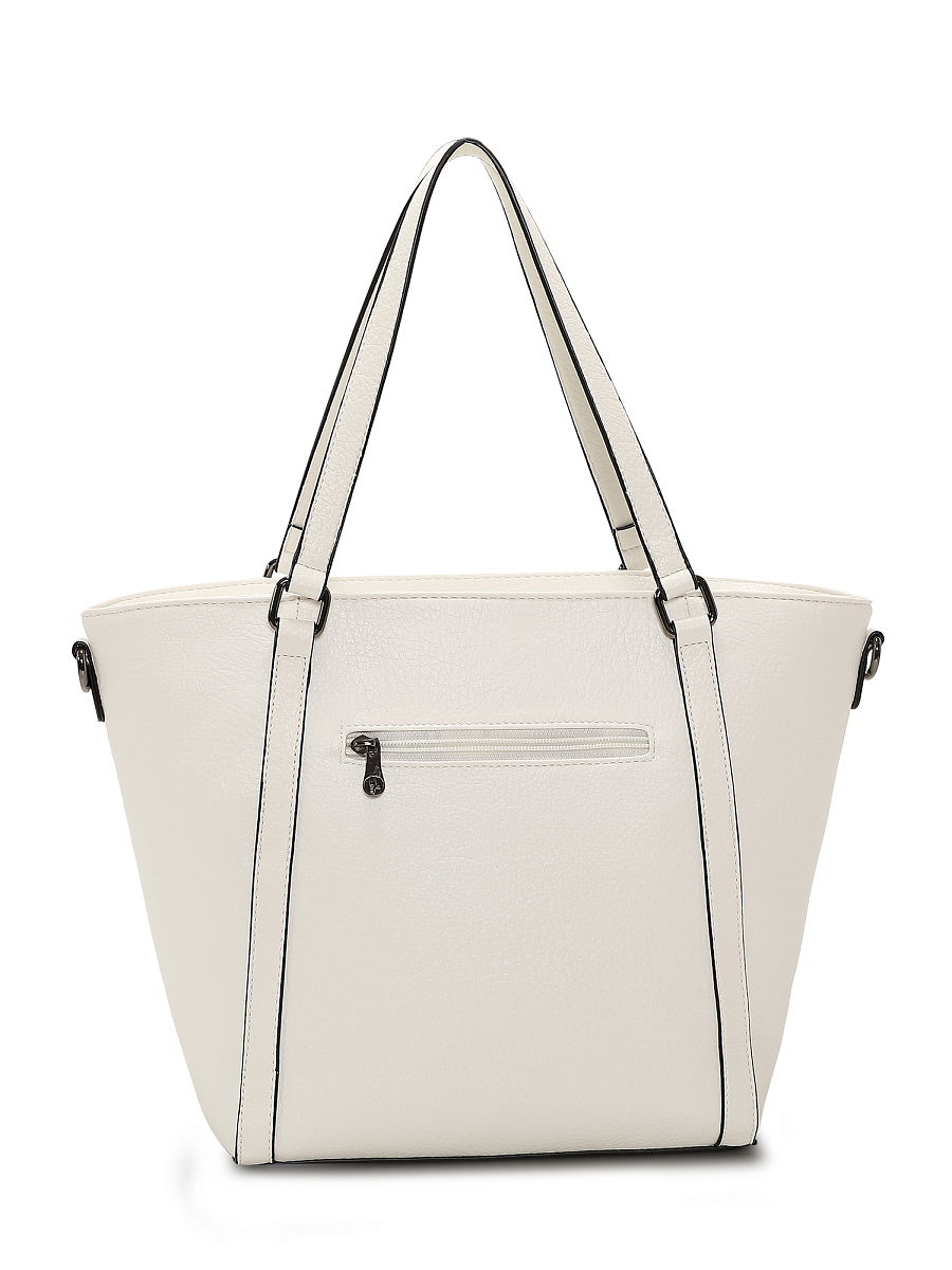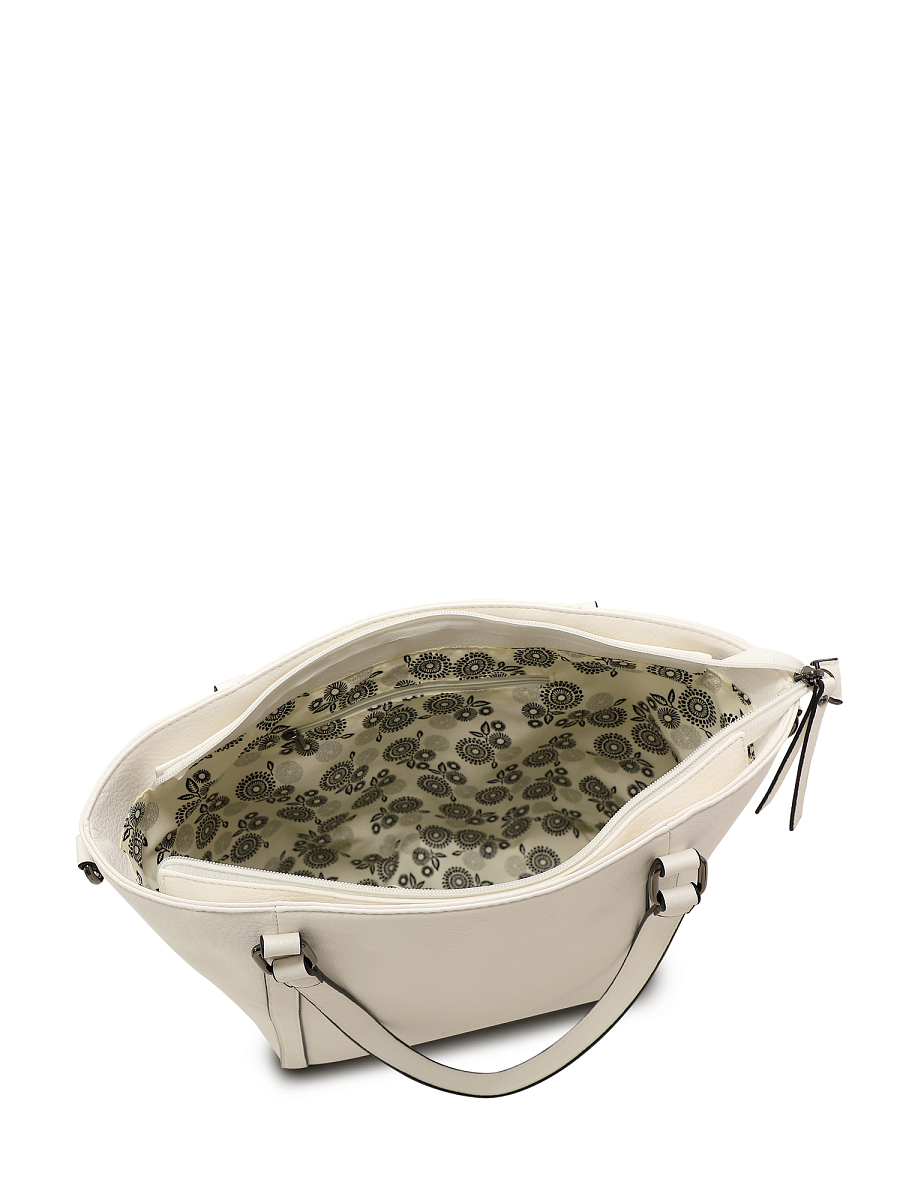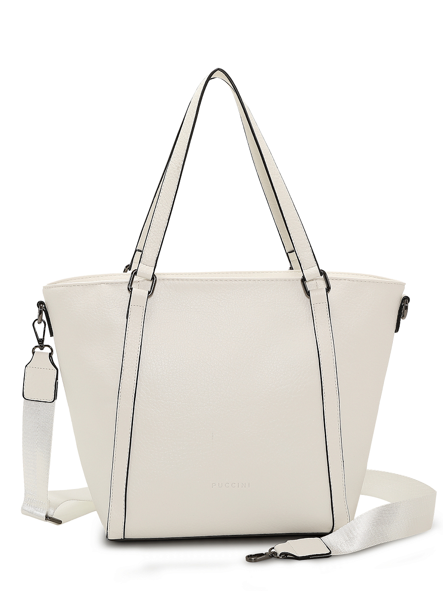 Elegant og romslig veske fra Puccini i stilren hvit skinnimitasjon. Vesken har et solid hovedrom med glidelås som gir enkel tilgang til alt du trenger i hverdagen. Innsiden er fôret med et dekorativt mønster og har både en glidelåslomme og to åpne lommer til småting eller mobil. På baksiden finner du en praktisk lomme med glidelås samt et stroppfeste som gjør at vesken kan festes på en trillekoffert – perfekt for reiser. De doble bærehåndtakene har en komfortabel lengde, og den avtagbare og justerbare skulderremmen i vevd nylon gjør at du kan bære vesken både på skulderen og crossbody. Metall-detaljene i gun metal-finish gir et moderne uttrykk. Laget av veganske materialer.