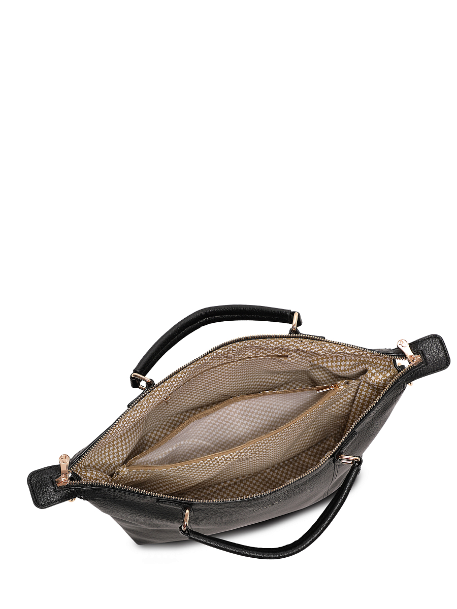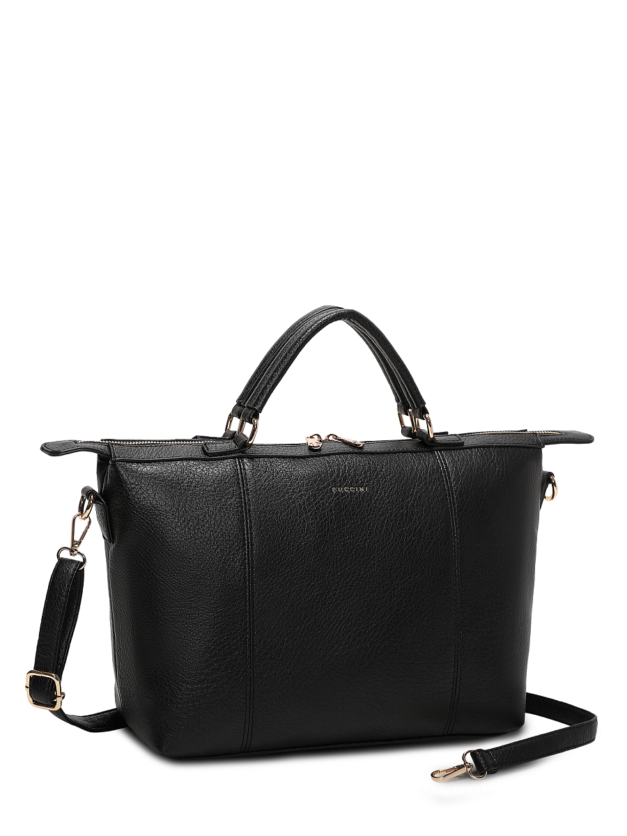 Elegant og romslig håndveske fra Puccini, laget i myk og strukturert skinnimitasjon. Vesken lukkes med glidelås og har et smart innvendig design med midtlomme som deler hovedrommet i to separate rom. Dekorsømmene på fronten gir et sofistikert uttrykk, mens den brede bunnen med metallføtter beskytter vesken mot slitasje.