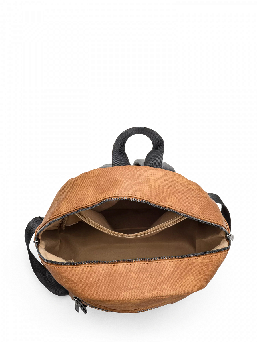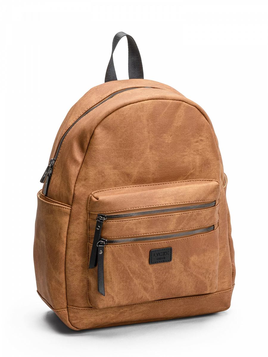 Tøff og romslig unisex-ryggsekk, fra Lycke Oslo. Materialet er imitert skinn og har en behagelig, lett vokset overflate med tydelig tofarget effekt, som gir liv til produktet. Den har polstrede, justerbare skulderstropper og et enkelt bærehåndtak på toppen. Fronten er utstyrt med to dekorative glidelåslommer. Begge sider har åpne rom, perfekt for å holde vannflasken tilgjengelig. Hovedrommet har en stor åpning med glidelås, slik at du enkelt kan finne tingene dine.
